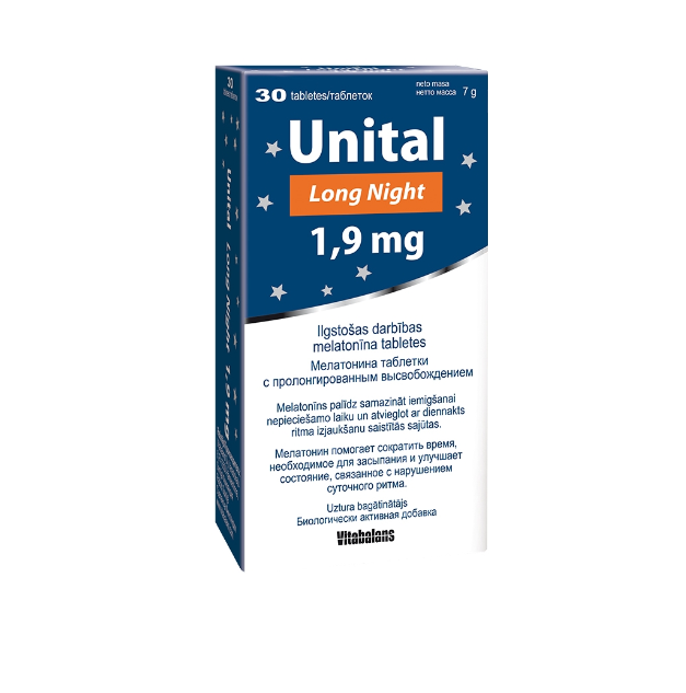 Unital Melatonin Long Night 1.9mg offers long-acting melatonin tablets designed to help you fall asleep faster and ease the feelings associated with disruptions in your circadian rhythm. This dietary supplement is perfect for those who struggle with sleep issues.