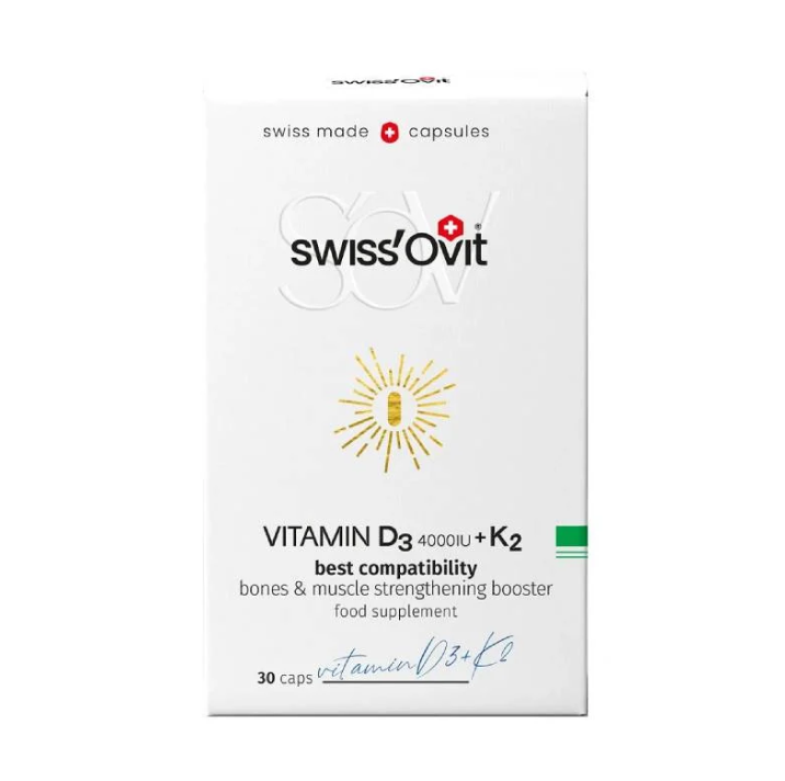 Swiss’Ovit Vitamin D3 4000 IU + K2 is a premium dietary supplement specially formulated to support bone strength, muscle function, and a healthy immune system. Combining the power of high-dose Vitamin D3 with bioavailable Vitamin K2, this formula ensures optimal calcium utilization and cardiovascular support – all in a single, easy-to-take capsule.
