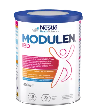 Nestlé Modulen IBD is a complete nutritional formula specially developed for the dietary management of Crohn’s disease. With a neutral taste and carefully selected ingredients, it is suitable for both exclusive and supplementary nutrition, always under medical supervision.
